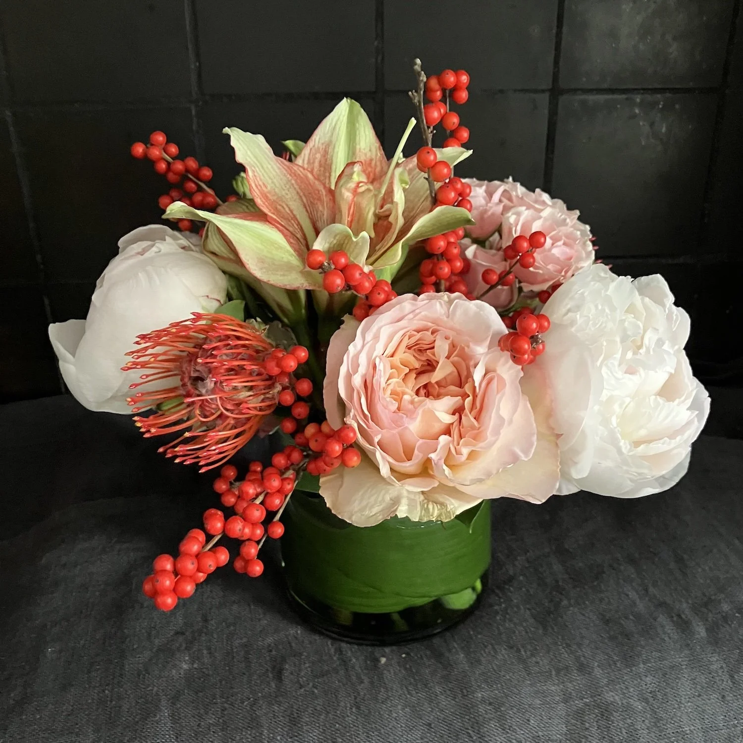 A large arrangement with colorful flowers such as blush roses, amaryllis, berries, and roses.